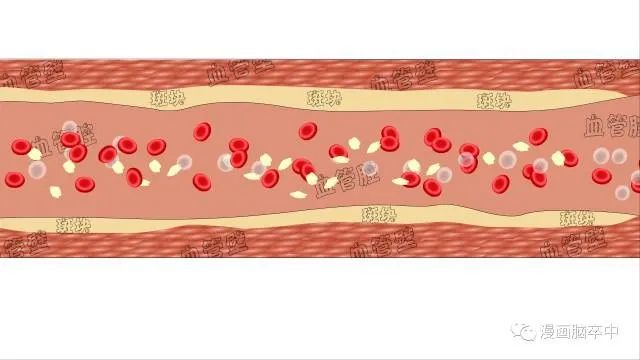 图中逐渐出现在血管壁中的黄色物质就是动脉粥样硬化的沉积物。随着时间的推移它会逐渐越来越厚,慢慢地阻碍了血液的流通,造成大脑部分缺血。