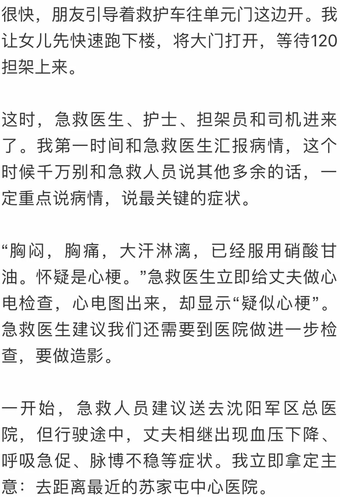 女儿是护士,我赶紧打电话通报,让她立即回家。同时,我打电话找向附近朋友求助:“我丈夫可能突发心梗,一会儿急救车就到小区了,你现在赶到小区门口,看见急救车指引他们一直到咱家,别让车浪费时间,快!”