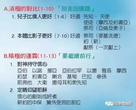 接着我们来了解一下希伯来书的架构:A、负面消极的对比(1-10章)『别走回头路』1.儿子比仆人更好(1-6章)好过 先知、天使
